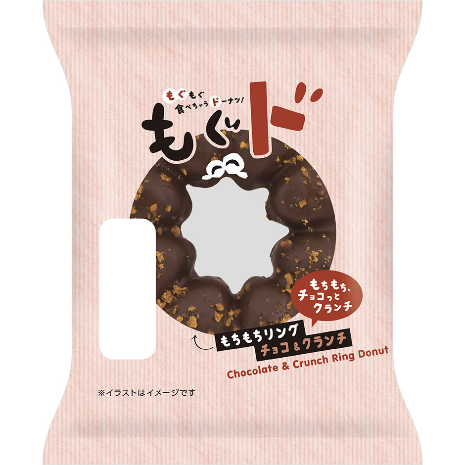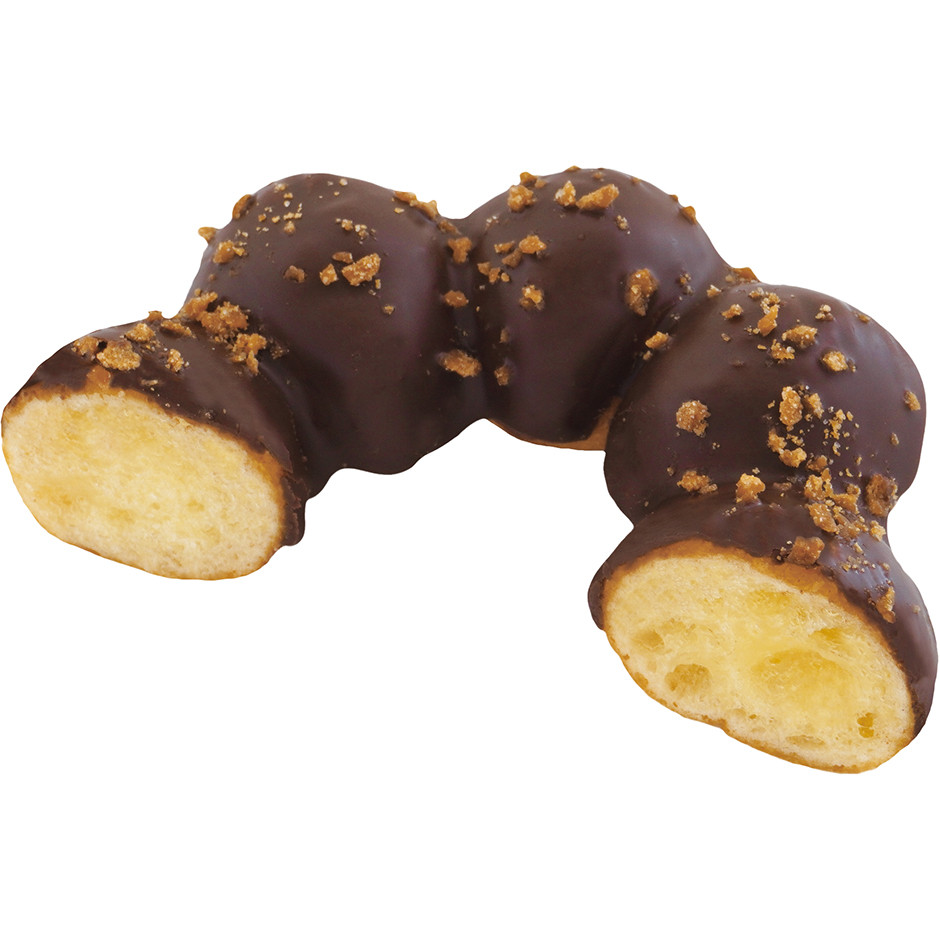 チョコでコーティングし、クランチをトッピングした、もちもち食感のドーナツです。
